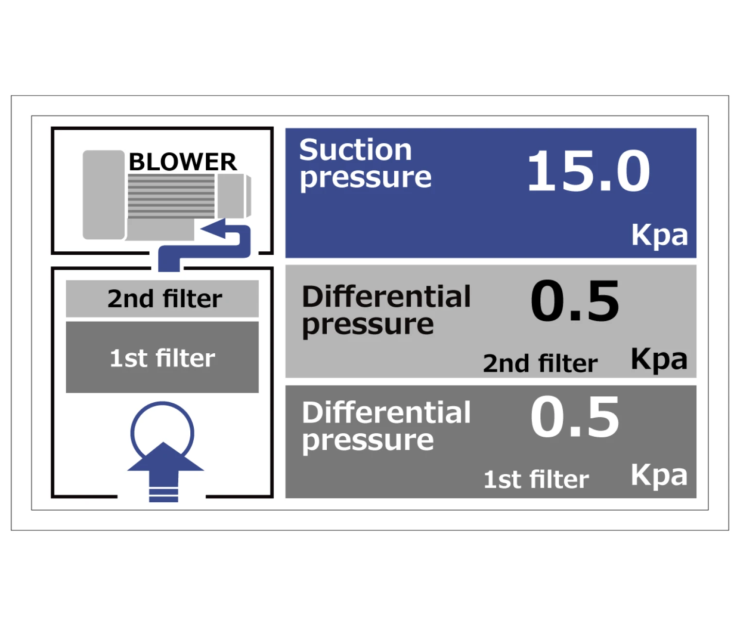 フィルターの目詰まり、配管の詰まりなどが原因で吸込圧が遮断条件を上回ると集塵機が停止します。