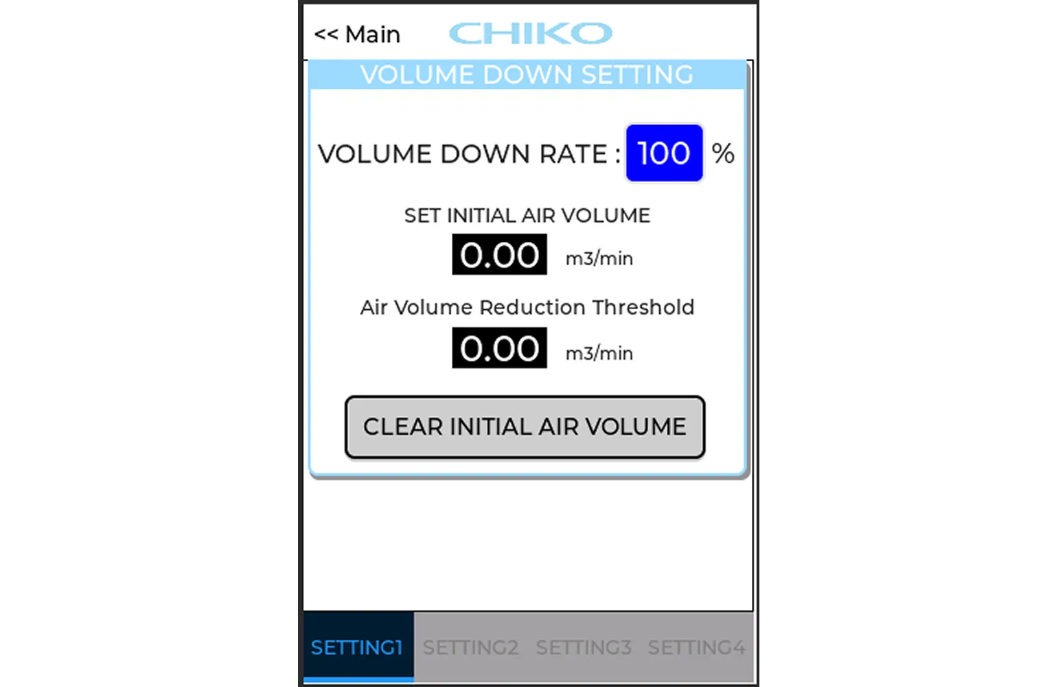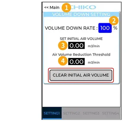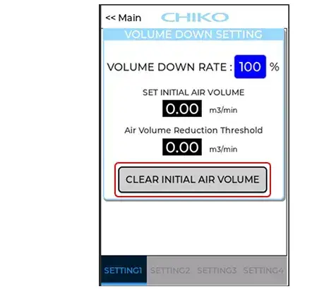 風量不足閾値設定(SETTING1)画面下部の[CLEAR INITIAL AIR VOLUME]ボタンを押し、登録した初期風量を削除します。